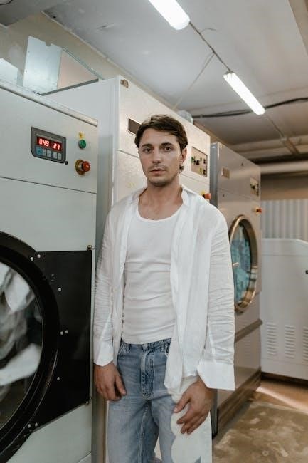 The Whirlpool Cabrio washer’s user interface is designed for intuitive operation, featuring a responsive control panel with clearly labeled buttons and a central dial. The interface allows users to effortlessly select cycles, adjust settings, and monitor the washing process. The dial provides tactile feedback, ensuring precise cycle selection. LED indicators highlight active options, while the touch-sensitive buttons offer a modern, streamlined experience. The interface is ergonomically designed for easy access and readability. Refer to the service manual for detailed instructions on calibrating the interface or addressing touch sensitivity issues. Regular cleaning of the control panel is recommended to maintain optimal functionality. The user interface is engineered to simplify laundry operations, making it user-friendly for all skill levels. Always follow the manual’s guidelines for troubleshooting and maintaining the interface. Proper care ensures consistent performance and longevity.